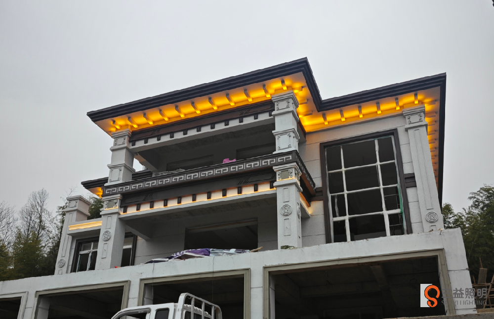 大福劉府是三層新中式別墅,外墻使用藝術(shù)仿石漆,搭配暖白色燈光,效果溫馨又豪氣。
